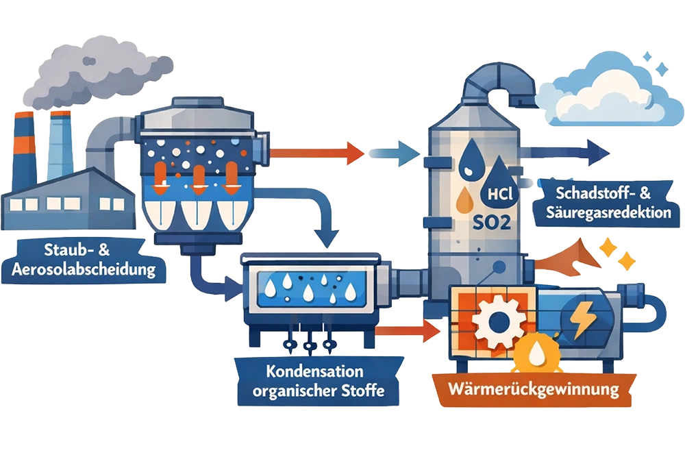 Abgasbehandlung für thermische und thermochemische Prozesse zur Einhaltung regulatorischer Grenzwerte und Rückgewinnung nutzbarer Energie.