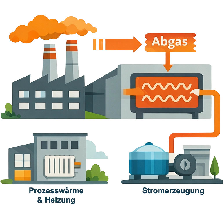 Nutzung industrieller Abwärme aus Abgas, Dampf, Heißwasser oder Thermalöl zur Versorgung thermischer Prozesse oder energetischer Weiterverwertung.